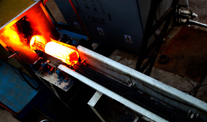 該智能流水線將鍛壓和碾壓軋制工藝融為一體,從毛坯下料、上料、加熱、初鍛、碾壓成型到成品輸出,實現(xiàn)了自動化流水作業(yè)。它是我公司《起重機(jī)車輪碾壓成型新工藝裝備》、《起重機(jī)車輪鍛壓用新型加熱工藝裝備》等多項專利技術(shù)成果轉(zhuǎn)化為生產(chǎn)力的標(biāo)志。